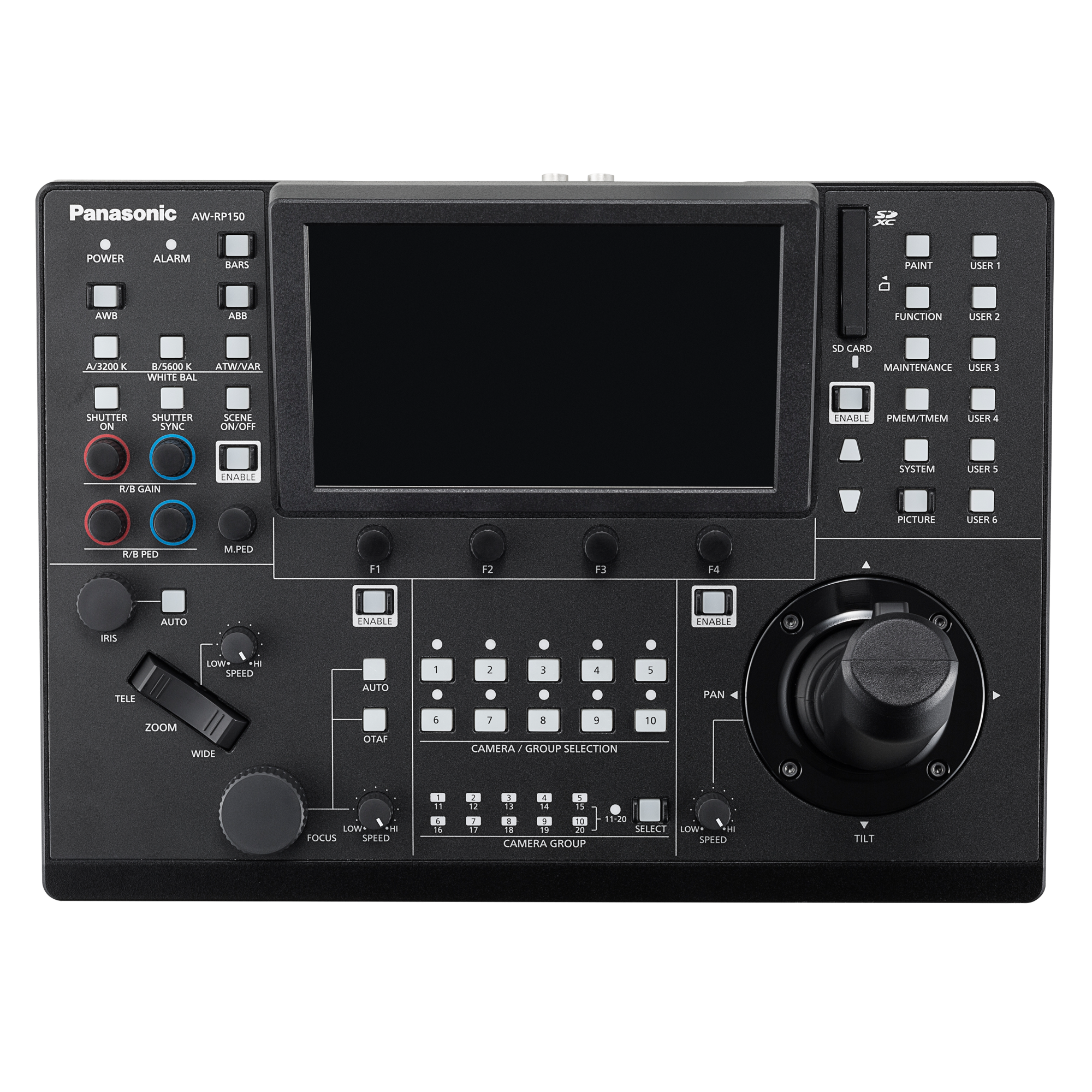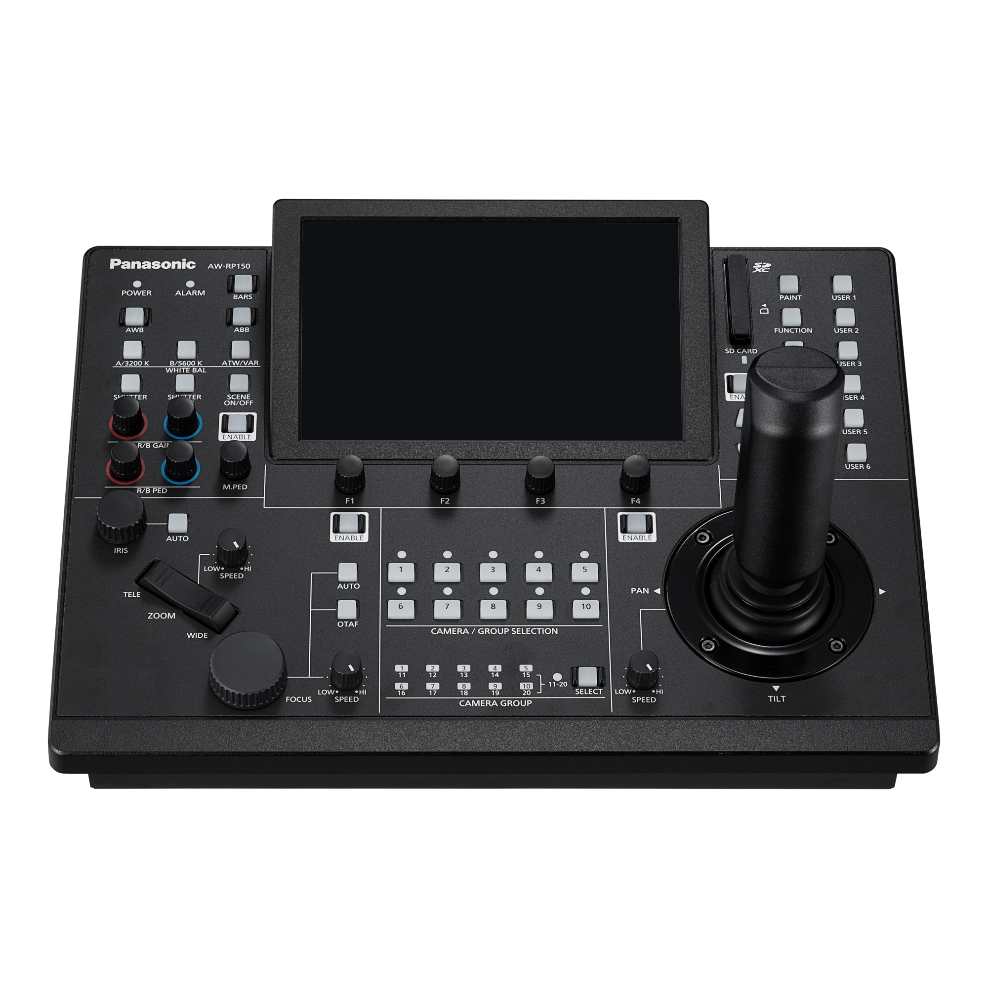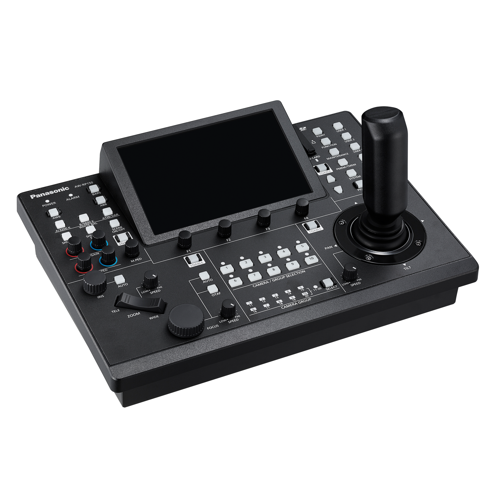 Die neueste Remote-Kamerasteuereinheit, die AW-RP150, ergänzt perfekt die professionellen PTZ-Kamerasysteme von Panasonic. Obwohl sie grundlegend die gleichen Funktionen wie die AW-RP120 und AW-RP50 bietet, zeichnet sie sich durch bedeutende Verbesserungen aus, darunter einen neuen Joystick, der mit einer Hand bedient werden kann (für PTZ- oder Fokussteuerung), sowie einen großformatigen LCD-Touchscreen, der als Monitor und für Menüeinstellungen dient.